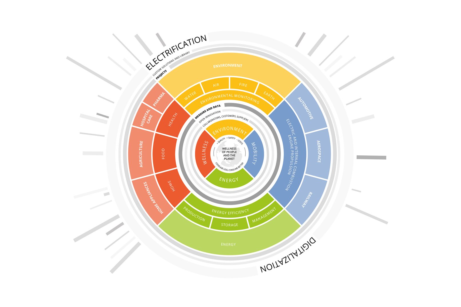 An infographic to define the continuous search for the method that enables a group to move toward ever new visions but with the same purpose. Research, led back by the company owner and designers, philosophers, engineers, data scientists, is the representation of the company’s mission, the factor that engages people and catalyzes energies.
